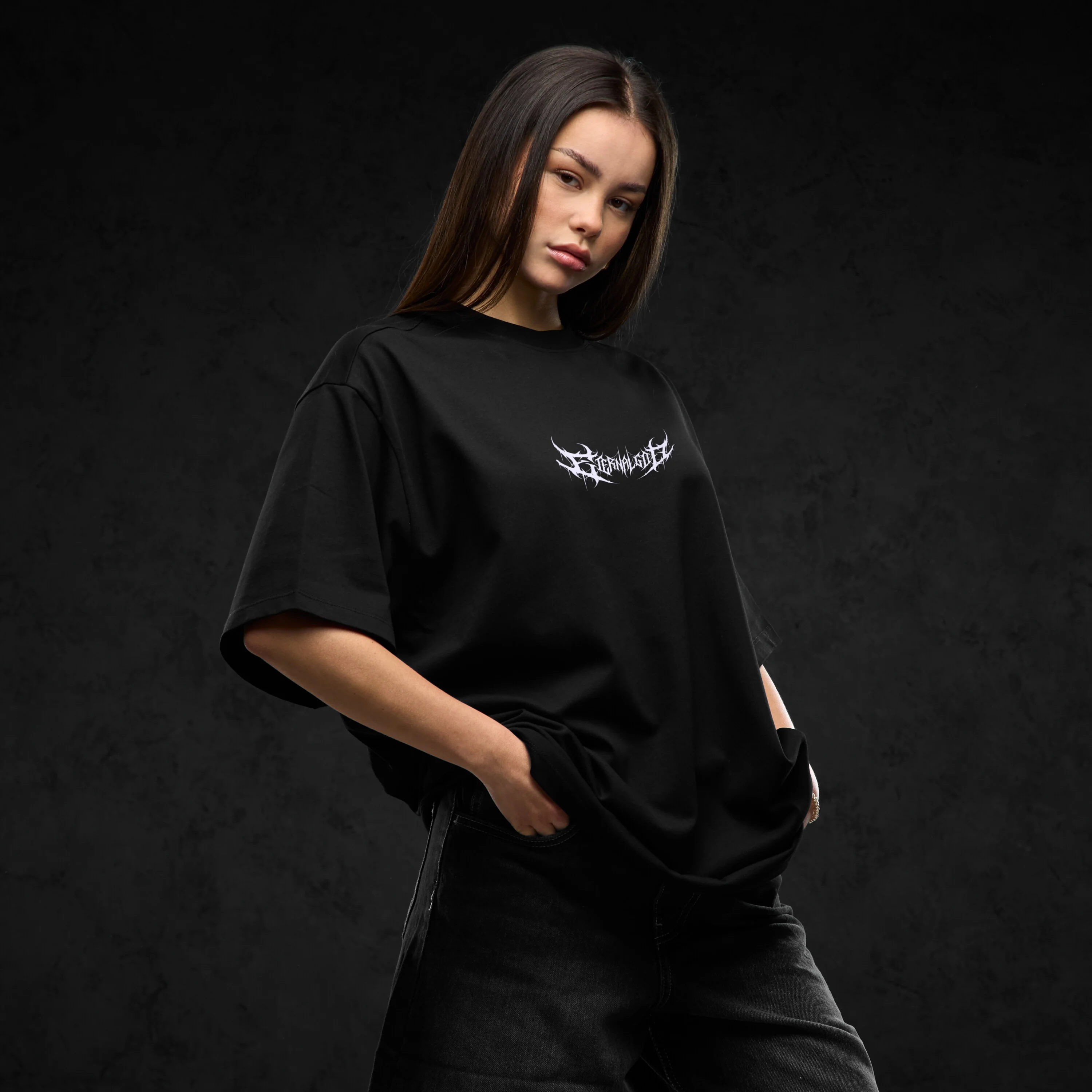Eternal God "Myna" Unisex Tee in Schwarz mit Druck auf Vorder- und Rückseite.