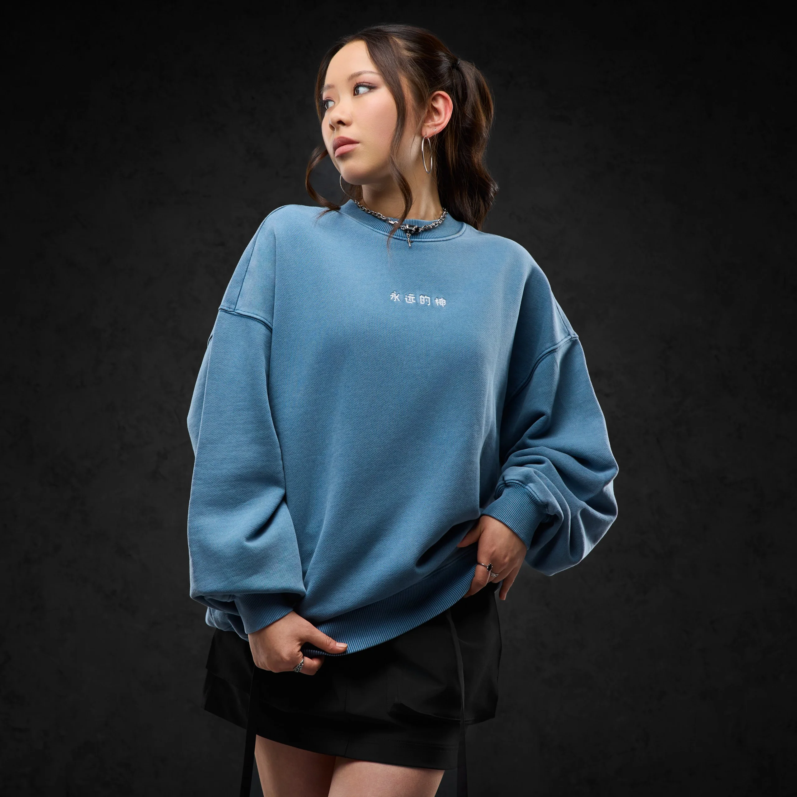 Eternal God "Sad Kira (washed teal)" Unisex Sweater in verwaschenem Blau mit Logo Stick vorne und Druck auf der Rückseite.