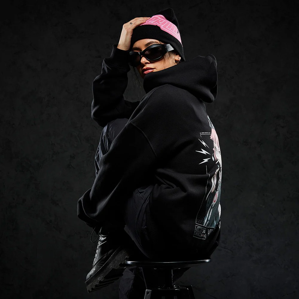 Das weibliche Model (1,65m) trägt den "Koya" Hoodie in Größe M.